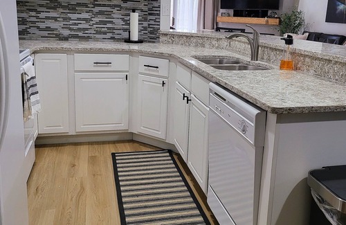 Our Unit is located on the parking lot level. There are 3 good-sized bedrooms and 2 full bathrooms. The master bedroom has a king-size bed with large tv, a desk, direct access to the patio deck, and it's own private bathroom. The second room has a queen size bed with a chair, and a tv, and the third bedroom, which is the bunk room has 2 twin size bunks, a queen bed, a tv and a Big Joe chairs Our unit is fully stocked with dishes, pots and pans, utensils, coffee maker (k-cups and drip), iron, steamer, blow dryers in each bathroom, bath towels, and pool towels. We have a washer and dryer for your use along with detergent pods. There is a charging station for IOS and Android devices for your convenience. We also provide you with a starter pack of paper towels, toilet paper, trash bags, mini shampoo and body soap to get you started. We ask that you bring an additional supply if needed.