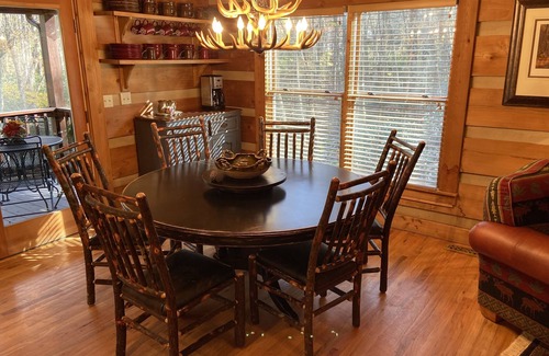 BrookView is an aptly named, enchanting log cabin atop a lovely brook. Set in the woods in Fair Mountain Acres and surrounded by rhododendron, but less than 5 miles from downtown Blowing Rock. This large 2,400 square foot, air-conditioned home provides three outside porches (all furnished with comfortable seating and tables for dining). The top back porch is screened and overlooks the brook. Along with the brook, the secluded one acre lot includes a fire pit for cooking hot dogs or smores with the family.