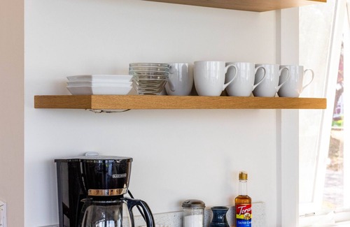The well appointed kitchen features an induction stove, new cookware and a large island seating 4. The dining table comfortably seats 8. Steps away, the outdoor stone terrace offers a gas grill and dining table for an unbeatable al fresco dining experience .