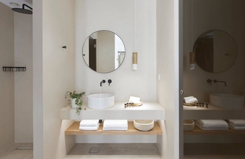 Snuggled up in serene Adamanta district, on the west side of Milos island, the brand new Arco Solium Suites perfectly complement the peaceful surrounding landscape with its minimalist aesthetics and sophisticated stance. The suites are bathed in natural light, copiously diffused in the spacious interiors, bringing out their free-spirited decoration. Oozing an air of unpretentious luxury, combining pure cotton-white with impressive earthy details and smooth lines, all suites offer upscale amenities, comfortable furnishings, lounge areas and modern, en-suite bathrooms with bathtubs.
