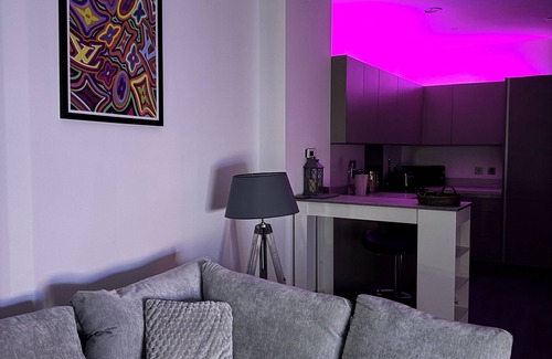 LED lighting throughout the apartment, creating a chic, contemporary atmosphere