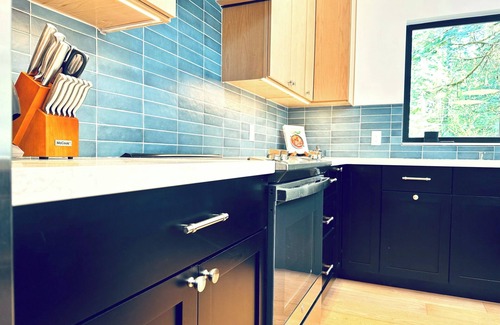 -Chef’s Kitchen: Italian tile backsplash, stainless steel appliances, hidden microwave, premium cookware.