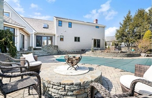 The upstairs hosts two very large bedrooms and comfortable third room. The suite bedroom includes a king-sized bed, an electric fireplace, a spa shower and a walk-in closet. Down the hall is another very large bedroom with a queen-sized bed and air hockey table. The third bedroom is smaller but spacious with a queen-sized bed. The two additional upstairs rooms share a full bath with a tub, as well as two half-baths downstairs. You will find well-appointed details throughout the house, such as a "smart" stove and oven, granite counters, and wood floors everywhere. Outdoors is ample "play space" for children including swimming pool, basketball, and large yard for all sports.