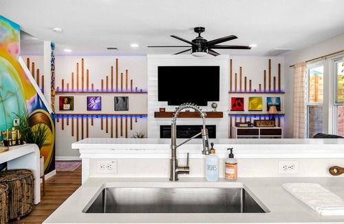 Welcome to Wanderlust ATX, where we offer not just a place to stay, but an incredible experience. As you open the front door you step into the International Music Hall. You will see handcrafted wooden soundbars with some of the most recognized album covers of all time. Don't forget to pop on the LED lights so you can get the whole effect! As you make it into the main room you will turn to see the entire wall covered by a Wanderlust themed mural that was created by one of Austin's top graffiti artists. We are not just going to tempt you with those records, we have a record player and records for your enjoyment. (Pro Tip: The LED lights can be programmed to go with the music). The whole first floor is a curated design by a team of skilled interior designers and artists!