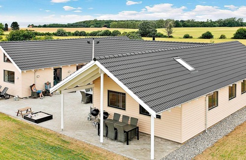 Holiday cottage located approx. 500 m from the ocean at Skåstrup water. Personalised decorated with modern furnishings. The house has simply everything the heart desires of activities and opportunities for development. There is a small ocean view from the kitchen. The house is very spacious and well-dimensioned and built around two separate sleeping sections. Each section has a bathroom and there is an additional bathroom in the pool area. A total of four bathrooms, all have underfloor heating. Geothermal heating throughout. Dining/living room is tastefully furnished with a stereo with CD player, flat screen TV, DVD player, high chair, living room and wood-burning stove. The house has 8 bedrooms. All rooms with double beds have box-mattresses. In addition, large and spacious mezzanine with TV and bean bags. In the activity room you can play billiards, electronic darts and table tennis. The kitchen has 2 fridge/freezers, 2 wash basins, 2 cookers with ceramic hobs and a dishwasher. The house has a pool area with both large a swimming pool, water slide, swim coach, large built-in whirlpool and sauna for 4-6 people. The swimming pool is 18m ² and has a slide for the kids. There is also a counter-current system so all week you can improve your fitness with daily strokes combined with pure relaxation in the whirlpool and sauna, located in the pool room. The crackling fire from the wood-burning stove can be enjoyed indoors for socialising. There are several televisions in various departments and DVD players. On the spacious plot that surrounds the house there are swings, and sandpit. Covered terrace of 15m2. There is a trampoline (usage at own risk/insurance). Payment for deposit must be paid in cash to the concierge at the house.