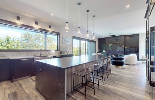 Main level has a grand chef's kitchen with Decor appliances and custom cabinetry. Island seats 6-7 with great water views from the very large kitchen window. Living room has a linear gas fireplace, access to the middle rear deck with plenty of comfy seating to enjoy the views, and open to the Dining Area. Main level also has a powder room with a Toto bidet and warmed toilet seat, laundry room, and the Primary bedroom. Primary bedroom has a King bed, full bathroom with a Toto Washlet bidet.