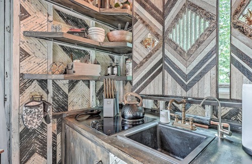 Guests enter into abundant natural light that pours through a wall of floor to ceiling antique farmhouse windows, and also features a beautiful crystal chandelier, and fairy lights. A modern Queen bed, record player, bar height dining area that can also be used as a desk, and a kitchenette with microwave, mini fridge, sink, and stove-top. Finishing off the cozy space is a working free standing fireplace and coffee bar.. For your entertainment, the treehouse includes modern technology to keep you connected, such as Starlink WiFi and TV, and vintage-style record player, while thoughtful touches ensure your comfort and safety. Guests love this distinctive, serene spot where privacy and elegance converge. Outside on the main level deck is a outdoor shower with roof, romantic swing bench, grill, pizza oven, and shaded dining table with a view of the marsh and trees draped with Spanish moss. A set of luxurious robes are provided throughout your stay and a starter kit of eco-friendly amenities are included for your convenience.