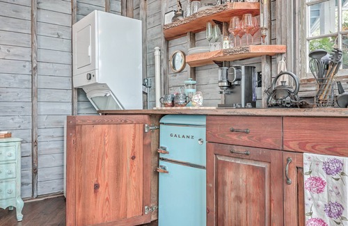 Guests also have exclusive access to the expansive yard space and fire pit area in front of the treehouse. Lay on the king size swing bed under the house and gaze up at a painted mural of rainbow row, or enjoy the large front yard and smores or drinks by the fire pit area.