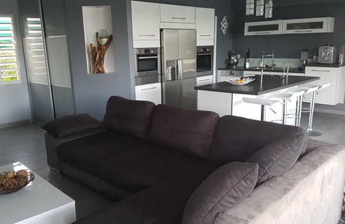 The living room of 45 m² located in the center of the house consists of a kitchen with central island, American fridge, oven, microwave, dishwasher (adjoining pantry with many small appliances: coffee maker, toaster, yogurt maker , blender ...), and a sitting area with sofa, flat screen TV, WIU console. It overlooks a covered terrace of 45 sqm which invites you to relax with a lounge area (outdoor sofa) to enjoy your Ti punch, a hammock and sun loungers or lounging, and a table to take your meals (barbecue and plancha), all overlooking the pool and garden. Salt pool 7m x 4m, pool games and mattresses