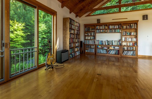 A grand staircase leads up to the second floor, opening onto the living room which has a another working fireplace, an ample leather couch and chairs, a music and library alcove and magnificent views.