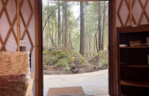 Come and relax! This unique and beautiful 18' yurt is tucked into a lush watershed area. Surrounded by Ferns, Madrones, Incense Cedars, and Doug Firs, you will never know you are only two miles from town. Our property connects to the Woodpecker Preserve and the Gracie Trail if you hike up the mountain. With a natural creek right outside your door and hiking trails right off the deck, this serene and beautiful yurt retreat awaits you.