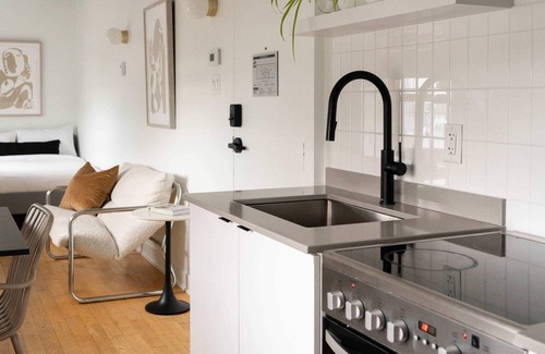 Our one-bedroom double size bed suite is a loft apartment located on the 4th floor of the property, with a city view and a glimpse of the St. Lawrence River. The suite is approx. 350 SF, beautifully designed, with lots of natural light. The suite is fully equipped for short, medium and long stays. Laundry machines are located on the 4th floor and can be used between 8am and 10pm. We offer amenities through the stay such as shampoo, conditioner, body gel, hand soap, coffee pods, dish-washing soap, washing machine pods, and cleaning supplies.