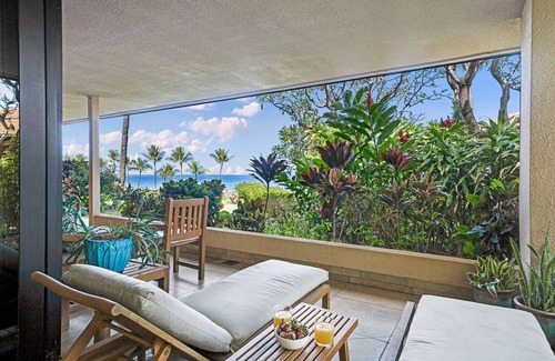 Feel the warmth of aloha as you step into this tropical oasis! Two 3-panel, floor-to ceiling glass doors fully open the living and dining rooms to the lanai, bringing the beautiful tropical air and ocean-front scenery right into your living space. Hand-carved teak furniture fills the condo, and every textile showcases Hawaiian beauty. Cooking in our fully-stocked kitchen is a delight, and you will love eating on the lanai while watching for whales!