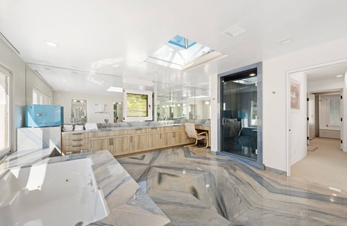 The primary suite encompasses the entire top floor with his and her walk-in closets, custom blue marble bathroom w/ dual vanity and water closets, skylight and soaking tub w/ ocean views. The primary bedroom features a fireplace and sliding glass doors that lead out to the balcony and west facing sunset views.