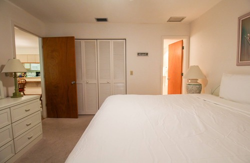 Upon entering the condo, you will find a bright and open floor plan. The kitchen is right of the front door and has plenty of countertop space to prepare your family’s favorite treats! The dining room has a lovely wood table that can accommodate up to five comfortably. The living room has a large plush couch, two adjoining chairs, and gorgeous views of the mature landscaping from the patio. The patio is welcoming and quiet with seating for four.
