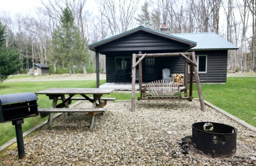 The outside picnic area for Maple Grove Cabin includes a swing by the firepit. A large back porch has been added, enhancing your outdoor enjoyment. There is a picnic table, charcoal grill, and firepit in the picnic area. The front entry porch has a roof and is covered.