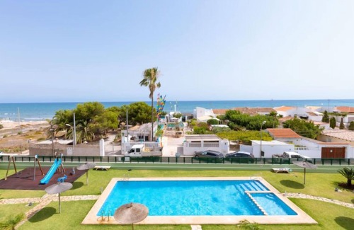 Les Deveses 11 km from Dénia: Very modern, luxurious apartment block "Marina Park". 3 km from the centre of Els Poblets, outside the resort, 11 km from the centre of Dénia, in the district Les Deveses, in a quiet, sunny position, 30 m from the sea, 30 m from the beach, in a cul-de-sac. For shared use: large garden (fenced) with lawn and trees, swimming pool angular (14 x 6 m, depth 80 - 210 cm, seasonal availability: 01.Jan. - 31.Dec.). Children's pool, outdoor shower. In the house: lift. Shop 100 m, restaurant 120 m, café 130 m, pub garden 100 m, bus stop 250 m, railway station 12 km. The owner does not accept any youth groups.