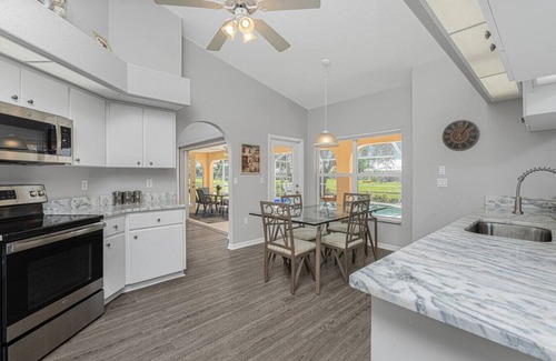 Marker Gulf Coast Getaway is a spacious 4BR/2BA home in Rotonda West that sleeps 9. Enjoy 2 living rooms, 3 dining areas, a primary suite with KING bed and SMART TV, and a heated pool with canal views—perfect for relaxing or fishing. The game room has a ping pong table, plus bikes, golf clubs, and beach gear. Just 10 miles to Englewood Beach and 12 to Boca Grande. Surrounded by 5+ golf courses, with restaurants and bars 5 minutes away. No pets, no commercial vehicles, no garage parking.