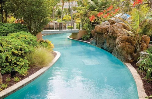 Aruba has great soft sand beaches with warm ocean water, great food, and wonderfully happy people. The Marriott Surf Club caters to families wanting to have fun with an on sight lazy river, outstanding pools, a spa , fitness center, and great living quaters.