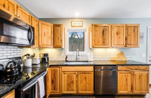 Main Level: Step inside to a warm and inviting open-concept layout featuring a bright living room with large windows and cozy furnishings. The gourmet kitchen is fully stocked and ready for everything from big group meals to quick breakfasts. Highlights include stainless steel appliances, generous counter space, and a dedicated coffee bar for your morning routine.