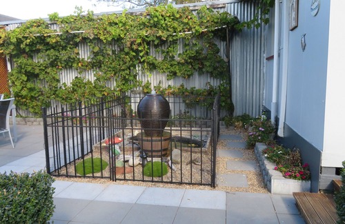 Located on a small farm. Relax in the peaceful garden with plenty of room for the kids to kick a ball. Two bedroom cottage with open plan dining/lounge, alcove off lounge with single bed. Lounge sliding door opens out onto a small deck and steps lead down to a patio with a pond/water feature.