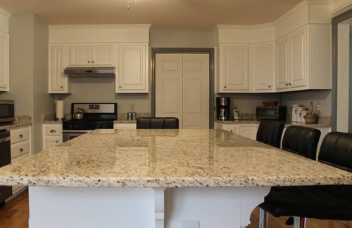 Masters’ Week Rental. Enjoy a brick 2-story home with 2,900 sq. ft. on a ½-acre lot with clean oak hardwood flooring & tile throughout. Gather or cook in an over-sized kitchen with new white cabinets, stainless steel appliances, & beautiful granite counter-tops. Converse on the leather living room furniture or share a meal on the 8-person dining table. Also on the ground floor, a large master bedroom suite has a queen-size Temperpedic mattress, 2-person whirlpool bathtub, and walk-in shower. A small attached room (former nursery) has a twin bed or can be used for luggage. Another bedroom downstairs has two oak twin beds with a trundle bed that can be rolled out. There is another full bathroom across the hall.