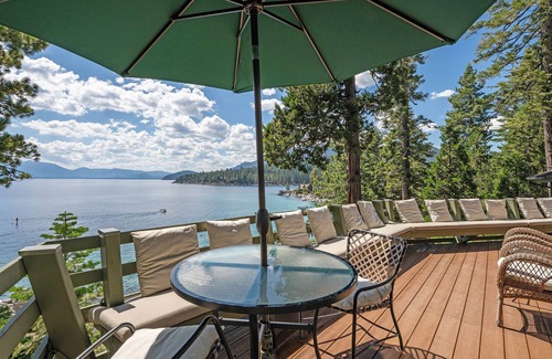 Amazing Meeks Bay lakefront property with private shared pier and personal buoy. Exclusive and private setting on Meeks Bay with panoramic lake views from almost every room. Updated kitchen, living area, and bedrooms. Lots of glass and gorgeous views of Lake Tahoe in this sprawling ranch-style home featuring a stone entry with bench seats and coat closet, large kitchen with 4 island stools and indoor grill, back laundry room, spacious carpeted living/dining area with cathedral style ceilings, wood burning fireplace, audio/visual center, and sliding glass doors leading onto ample decks and stone patio.