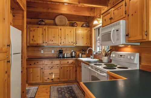 The cabin’s CD player, satellite TV, and DVD player provide your link to the real world when you need it. And if you don’t, our table nook provides a quiet corner to enjoy your favorite book or reconnect with your loved ones. The kitchen is uniquely well supplied with quality utensils and cookware that reflect the owner’s passion for cooking.