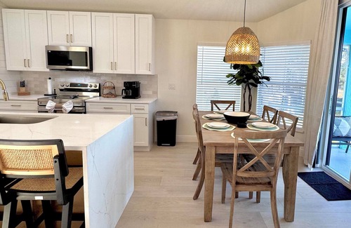 This completely updated and locally managed 2667-square-foot five-bedroom / three-bathroom, air-conditioned vacation villa sleeps up to 12. Pull into your private driveway and walk through the front door into the spacious, open-concept home. The great room is well appointed with comfortable furniture perfectly positioned to catch your favorite shows on the 86" Smart TV or gather around the wood-burning fireplace. You will be so amazed by the home's beautiful kitchen that may never want to go home. The open floorplan allows the chef to stay a part of everything going on when food is being prepared. Family will gather around the super-sized island for a snack or a cup of coffee and it has extra seating for four.