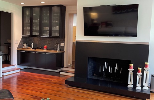 Our recently renovated mid-century modern ranch offers an inviting place for travelers to relax while visiting the Triad. The home is located on the 4th tee box of the prestigious Sedgefield Country Club's Donald Ross Golf Course, host of the PGA's Wyndham Championship each August. It offers a formal living room, 3 bedrooms - each with queen beds, 2 1/2 baths and a gourmet, eat-in kitchen with seating for 5 and a wood-burning fireplace. From the kitchen, step down into the open concept dining room with seating for 6. The dining room and a sunken great room with another fireplace and a wet bar are filled with sunlight from walls of glass offering beautiful views of the expansive and private backyard and golf course. There are beautiful, custom hardwood floors throughout. An outdoor patio with casual and dinning seating for 6 adds living space.