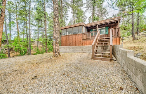 Within a five minute walk to Midtown, this updated, smart cabin comes with a view, screened-in deck, all surrounded by a forest of Ponderosa Pines, a Rio Ruidoso tributary and a sanctuary of wildlife. High speed WIFI, a workspace with a desk and external monitor, and all the creature comforts of home, this central retreat provides quick access to shopping, dining, hiking, lounging, skiing, all in the setting of a contemporary cabin with a retro feel of historic Ruidoso.