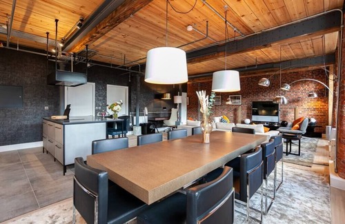 The dining area and lounge is spacious, light and relaxing with views over the canal. The 10 person solid wood Italian dining table surrounded by bare brick walls and solid wood ceilings, combines a homage to Manchesters industrial past with the Italians more 'moderno' approach to living. It is also an excellent work space for those who may be travelling on business.
