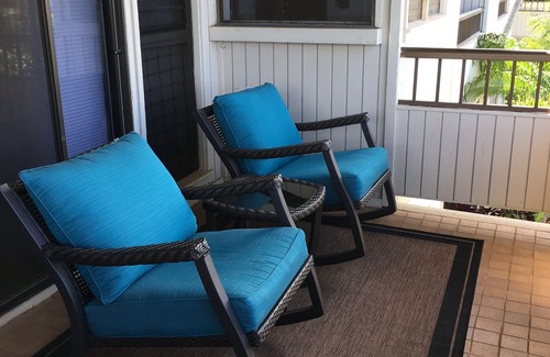 Second floor unit offers greater views and added privacy. Whole unit has open beam ceilings which adds to airy feeling. Afternoons can be a little warm with the afternoon sun. Cool trade winds come down off Haleakala and cool the whole unit in the morning and evenings. Full kitchen allows you to eat in when you want and when you don't want to there are many dining choices within a few miles. Kitchen is full equipped. Linens are provided. In unit washer and dryer. Master bedroom has queen bed and attached bath with tub. Second bedroom has two twin beds. Second bath has step-in shower stall. AeroBed queen blow up available for use for extra sleeping in living room.