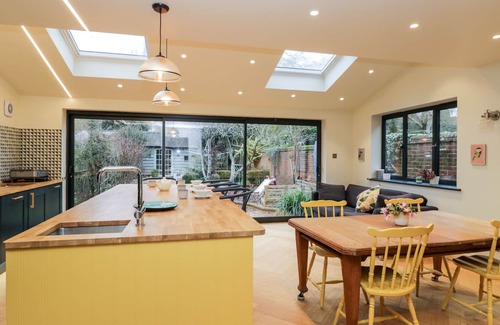 Amenities: Air-source heat pump. Electric oven, induction hob, microwave, fridge/freezer, washing machine, tumble dryer, dishwasher. Smart TV, WiFi, selection of books. Fuel, power, and starter pack for woodburning stove inc. in rent. Bed linen and towels inc. in rent. Highchair, travel cot and stairgate available. Private driveway for 2 cars. Enclosed rear garden with lawn, patio, furniture, shed, children's play area, and stream. Sorry, no pets and no smoking. Shop and pub 0.1 miles, Bourne Rivulet 0.6 miles. Note: There are steps to the exterior of the property. Note: Whilst the stream is shallow, please ensure that children are supervised at all times