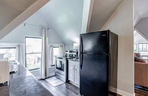 This apartment is part of a converted home that has been turned into a quad-plex. The porch and outdoor seating area is shared with other guests. This is one of the second floor apartments in a converted historic home with four apartments total. Some guests have mentioned the stairs might be a little steep. Guests will enter the building through the front door after parking behind the building. Once inside the front door, there are two bedrooms, one with a King bed and a twin, and the second bedroom has a double bed. There is also a queen sofa bed and couch in the living room. There are two full bathrooms with showers. This is a pet-friendly home, there is a $50 pet fee per pet, and additional costs if there is extra cleanup in the yard or home from your pet.
