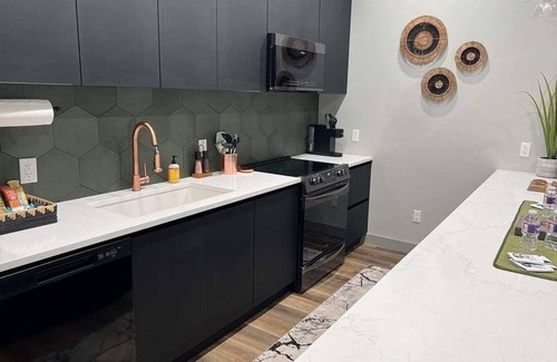 The fully equipped, modern kitchen invites your culinary creativity with its clean lines and earthy tones. Gather around the bar with seating and savor your delicious creations, enjoying a meal or a casual snack. Every moment here is designed to elevate your vacation experience.