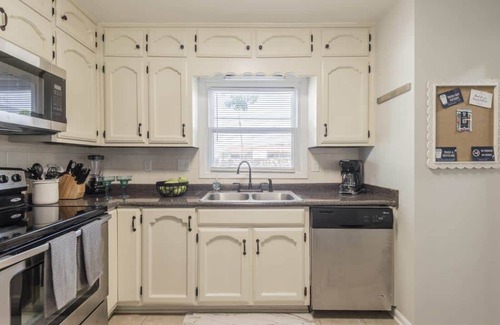 Guests will enter the home through the front door with a digital door code. Once inside, you will be welcomed into foyer where you'll find the stairs which lead to the bedrooms on your left and the spacious kitchen on your right. The kitchen is fully equipped with a full-size refrigerator, over, stove, dishwasher and microwave. You'll also find a cute bistro table and a full array of pots and pans! Just past the kitchen is the dining room with a table for four which overlooks the serene living room with a cozy couch and chairs, oversized TV and brick fireplace (While we would love to use this fireplace, unfortunately, it is for looks only!). There is a half bathroom downstairs.