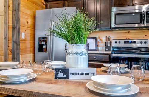 “No More 9 to 5” is a modern cabin with mountain views, just 4 miles from Dollywood and 2.8 miles to The Parkway. This 3-bed, 2.5-bath retreat sleeps 10 and includes a private hot tub, a game room with air hockey and arcades, a cozy fireplace, and a kids' campout area in the bunkroom. Relax on the inviting outdoor spaces, including a covered deck with cozy seating and a lower private patio with the hot tub. One king bedroom suite is on the main level and perfect for guests who prefer no stairs.