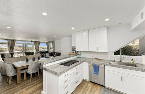 Enjoy this newly remodeled, luxury, two bedroom, two and a half bathroom, ground-floor, OCEAN FRONT condo in South Mission Beach. Walk off your patio and put your toes in the sand, enjoy beach volleyball or basketball, or just take a stroll down the boardwalk to Belmont Park. Enjoy the stunning sunset views over the Pacific Ocean every night of your stay. Your private patio includes a barbecue and relaxing furniture around a gas fire pit.