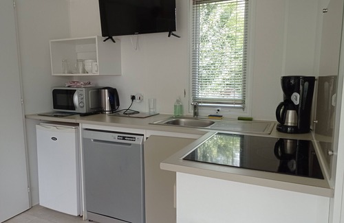 The kitchenette is equipped with a stovetop, a refrigerator, and a dishwasher, as well as a coffee maker, an electric kettle, and a microwave. Other amenities include a dining area, heating, and a dining table.