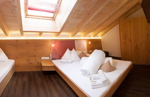 The modern duplex penthouse "Rubin" on 2 levels, with 4 bedrooms and exclusive outdoor sauna with panoramic glass roof, for 2 - 9 people. On the rooftop terrace with rattan seating, music system and effect lighting opens up a magnificent view over the rooftops of Mayrhofen. The fully equipped kitchen with brand-built appliances has a filter coffee machine, Nespresso coffee machine, toaster, dishwasher, oven, microwave and stove with ceramic hobs. The dining area with lounge is equipped with 40 inch flatscreen with satellite and Apple TV, X-Box360 with games and design stove for a special ambiance. Guests of the Rubin have a private high-speed Internet access via W-Lan available. The high-quality, modern bathrooms with hairdryer offer an exclusive shower / WC combination - an additional guest toilet is located on the lower level. Towels, tea towels, soaps, shower gels and private parking are available free of charge.