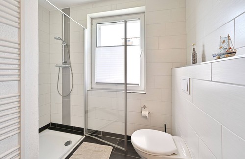 The bathroom is located upstairs together with the bedroom. It is equipped with a walk-in shower, a heated towel rail, a vanity, a toilet and a washing machine.