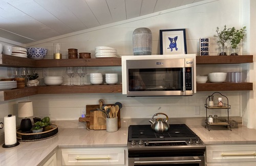 This cabin is a Masterpiece! 2 Minutes from the Self Creek Marina and boat ramp you won’t be disappointed with any of the amenities or ease of satisfaction! This luxurious vacation rental is nestled in a wooded escape close enough to Dallas but far enough to feel the remoteness and tranquility of the great outdoors. Before entering the home you will climb a few reclaimed historic log steps leading to the oversized front door and have option for wheelchair access ramp for handicap mobility. Once inside you will find the welcoming foyer capable of taking your breath away. With the family room and kitchen open to one another there is great space to unload and get acquainted to the finer things in life! The kitchen boasts top of the line appliances with every cabinet and drawer loaded full of your culinary needs. From the k-cup coffee maker to the old school percolator your mornings will have every reason to enjoy a warm cup of Joe on the front porch rockers. The family room has a wood burning fireplace to keep warm and offers a powder bathroom conveniently located for den and kitchen area. Off the kitchen is the laundry room with full size washer and dryer and shelving for pantry goods. The master is a retreat all on its own! This king size suite has bedside chandeliers that suggest the most romantic encounter. The master bathroom is enough to write home about as well! This Magazine worthy and designer inspired “wet room” will take your breath away! Hosting a footed tub, jet shower and three body sprays you will consider skipping the lake and splash in the comforts of this master bathroom. Dual sinks and mirrors make the space comfortable and easy to organize. The original root cellar of this historic cabin has been transformed to a second bedroom with two full size beds and its own bath en-suite with an over sized shower and modern bath elements.