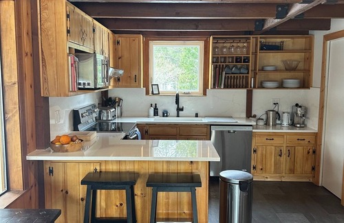 The cabin was built by Ben's parents in the early 80's and was renovated once we took it over as a family home. The appliances have been upgraded, all the windows replaced and the furnishings recently purchased. New towels, linens, mattresses, carpet and bathroom flooring give the cabin a fresh feel. The wood-burning fireplace creates a cozy atmosphere and heats the cabin well in winter. There is also a monitor heater, if necessary. The floor plan is open with a loft-like feel.