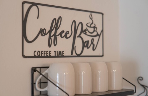 In the living room, there’s a sofa that can be transformed into a pull-out bed. There’s also a 55-inch smart TV, a work desk with a chair, and a coffee station! Plus, there are three roll-out beds available if needed for additional sleeping space.