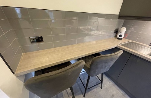 •Breakfast bar with stools and sockets for Laptop / work use.