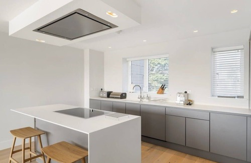 The house offers plenty of space for all to spread out and relax, and will serve as the perfect base for unforgettable family holidays. On the ground floor, discover a cosy snug with a 4K Smart TV and a double sofa bed, as well as a handy utility room, two double bedrooms and a family bathroom. Up on the first floor, the open-plan kitchen, dining and living space boasts floor to ceiling double doors that open out onto the balcony and flood the room with light. The sleek, modern kitchen has been kitted out with state of the art appliances: from a boiling water tap to a built-in oven and microwave, six-ring induction hob and Nespresso coffee machine. After long days out on the coast, rest weary limbs on the two comfortable sofas and enjoy a film on the large smart TV as the sea glimmers in the distance. It really is total bliss.