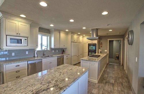 > Fully equipped kitchen with dishes, cookware, stove, oven, microwave, 2 fridge/freezers, dishwasher)