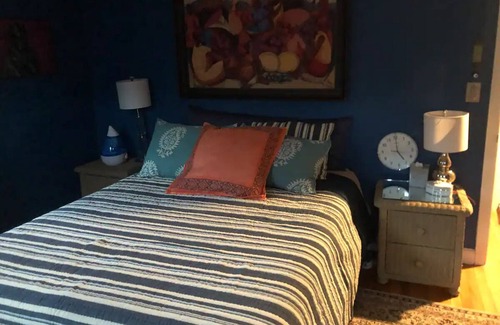 The bedroom and bathroom are up a short flight of stairs with a hand rail on one side only. Although I have two bedrooms, I only list one, because the other one is used for storage when I am out of town. The bedroom where you will stay has a comfortable queen-sized bed with nice linens, lots of windows that open, and stylish blackout curtains keep out light and insulate for sound, too. There is an empty dresser and closet so you have room to unpack.