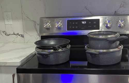 * A fully equipped kitchen with stainless steel appliances, cook wares, dinner wares, utensils, coffee maker, tea kettle, toaster, baking items. Also in stock are various spices perfect for cooking your favorite meals, vegetable oil, salt, pepper. Not forgetting ketch up, mayonnaise for your quick sandwich. You will sure feel at home in thus suite !